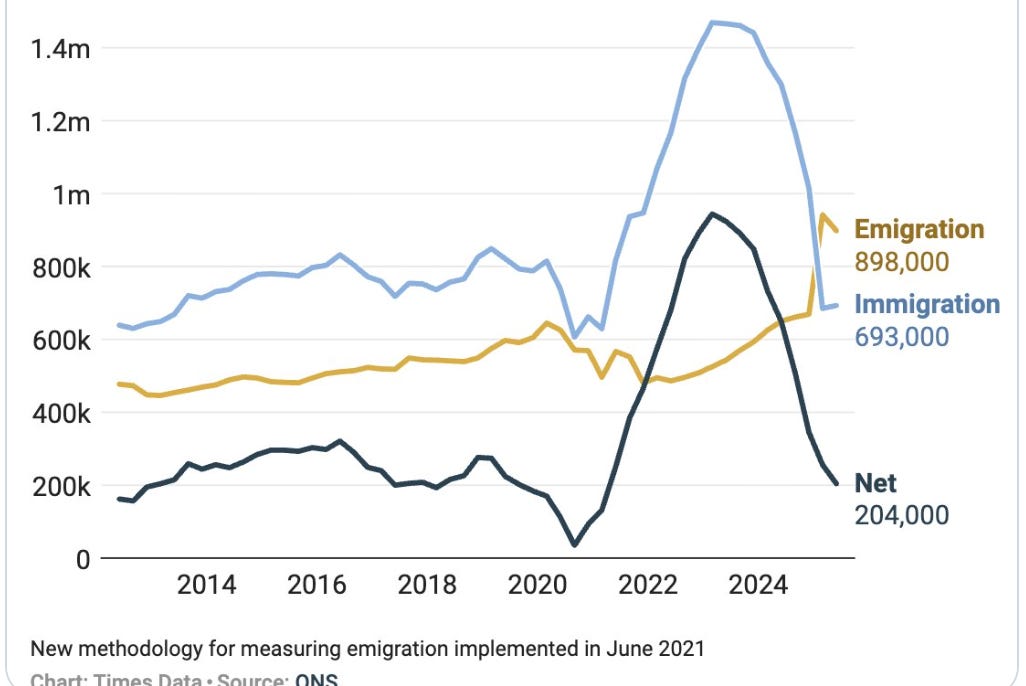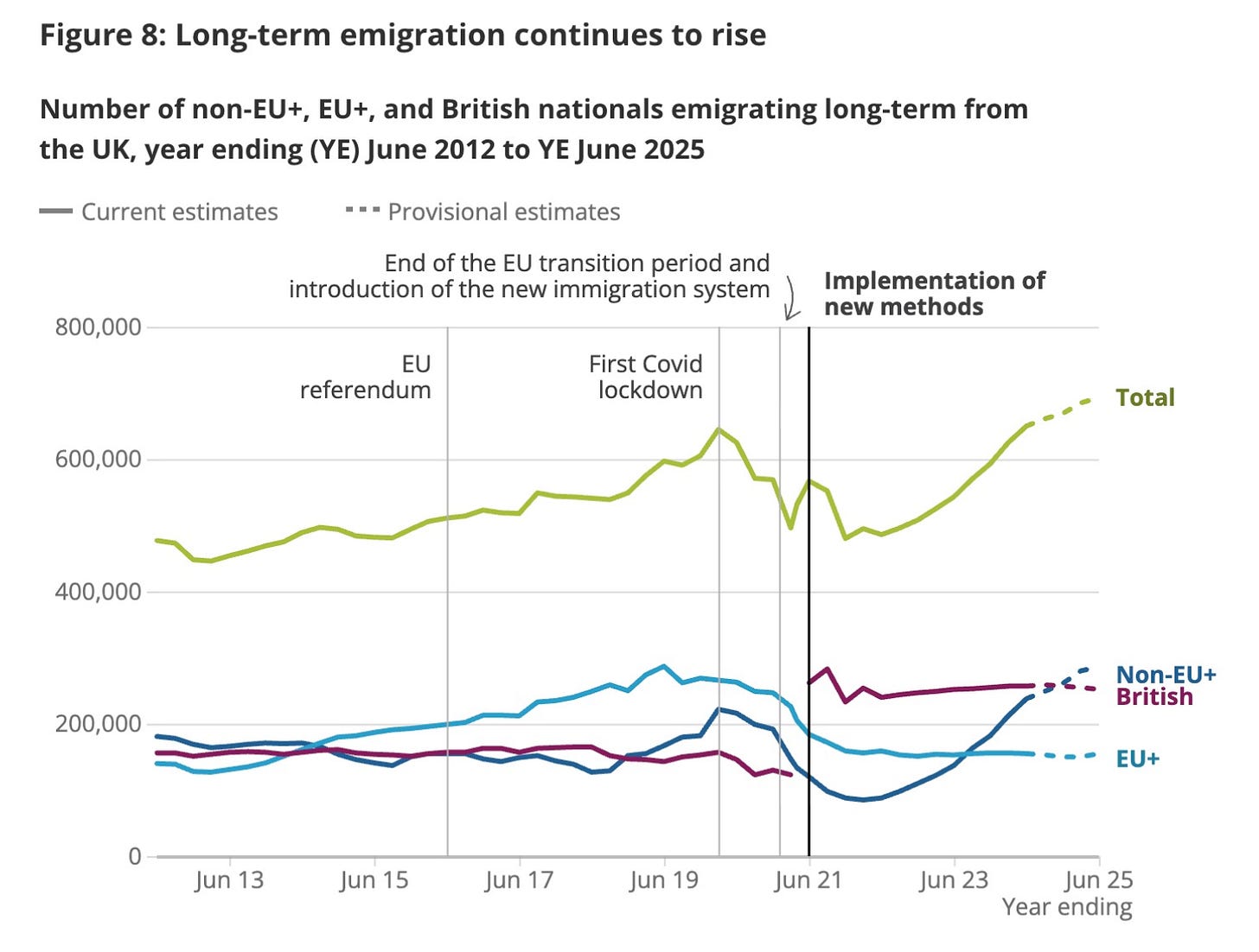 There are two big changes. One is remigration - immigrants leaving the UK for good - which has surged to about 400,000 a year. On top of that we have ~250,000 British citizens leaving: cue panicked headlines about brain drain. But I suspect a great many of these are, say, Poles with a UK passport returning to their now-booming homeland. Warsaw is actively poaching them, offering far lower taxes than they pay here.