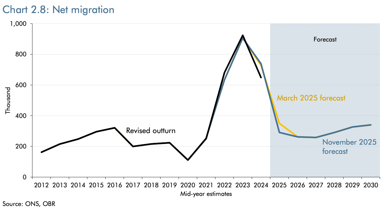 But a few weeks later, the actual figures were released. The big black line at the top, actual net migration, fell to 204,000 for the year to Jun25, far lower than anyone had expected. It will be lower still by now.